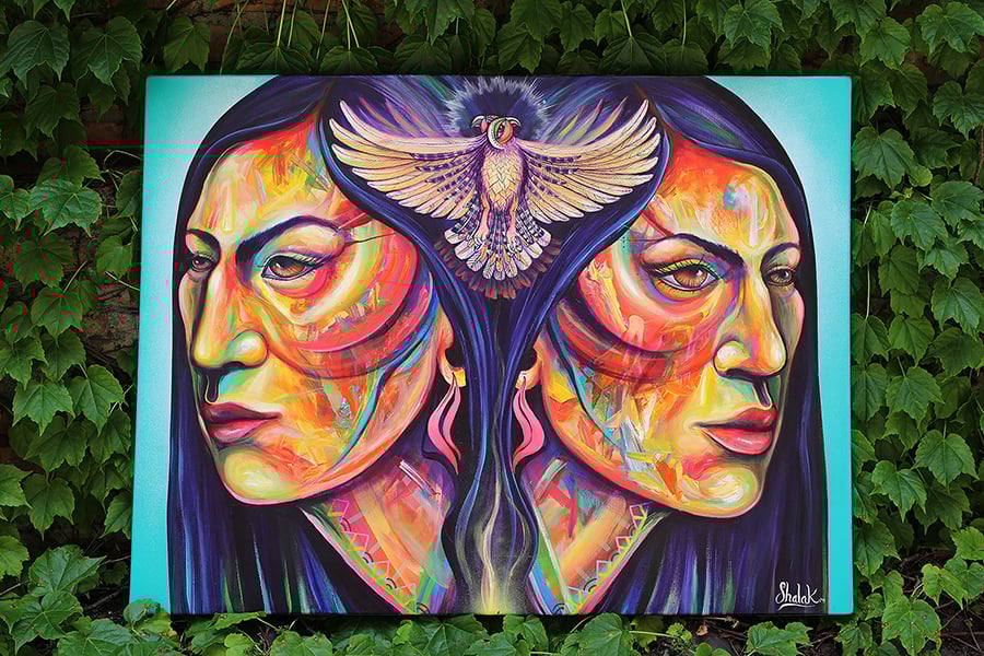Las Americas is originally a spraypaint and acrylic painting on canvas that was first exhibited at the Graffiti Fine Art Biennal in Sao Paulo, Brazil of 2013. This piece has become one of Shalak's more important bodies of work as it raised the bars both technically as well as conceptually within her artistic career.