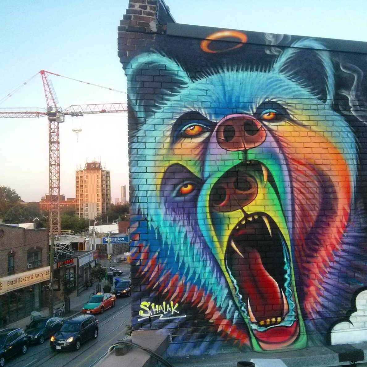 The Double Trouble Fine Art Print is a photograph of the iconic Street Art piece done by Shalak Attack on the roof top of Lula Lounge on Dundas Ave, Toronto, Canada. This piece has become very popular amongst Street Art lovers around the work especially renown for its very unique style, colour and concept. The fierce and raw double face of the bear creates an action-like movement where the border between the physical and spiritual world become blurred.